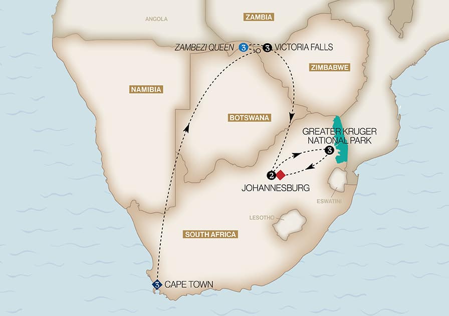Embark on an unforgettable journey through some of Southern Africa’s most acclaimed destinations, including the renowned Greater Kruger National Park—home to the iconic “Big Five” and celebrated as one of the top safari regions in the world. Begin your adventure in vibrant Cape Town, where you’ll experience must-see sights such as the Cape of Good Hope, Boulders Beach, and historic Robben Island. Next, fly north to our iconic Zambezi Queen for a three-night wildlife safari. Explore Chobe National Park by both water and land, encountering extraordinary wildlife in their natural environment. Continue to Victoria Falls, where you’ll spend three nights marveling at this natural wonder. Fly to Johannesburg for two nights in this dynamic city. Your adventure concludes with three nights at a five-star tented lodge in Greater Kruger National Park, featuring outstanding amenities, exceptional service and gourmet cuisine. Enjoy the thrill of twice-daily game drives led by expert guides committed to sharing their deep knowledge and passion for the region’s wildlife.